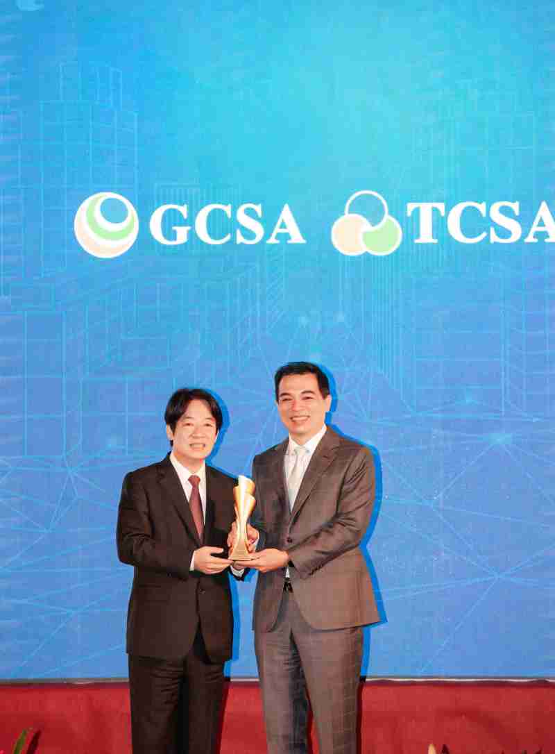 达全方位永续表现获全球永续奖及台湾永续奖肯定,,,由副总统赖清德颁奖 (左),,MG电玩总经理柯富仁 (右) 代表领奖